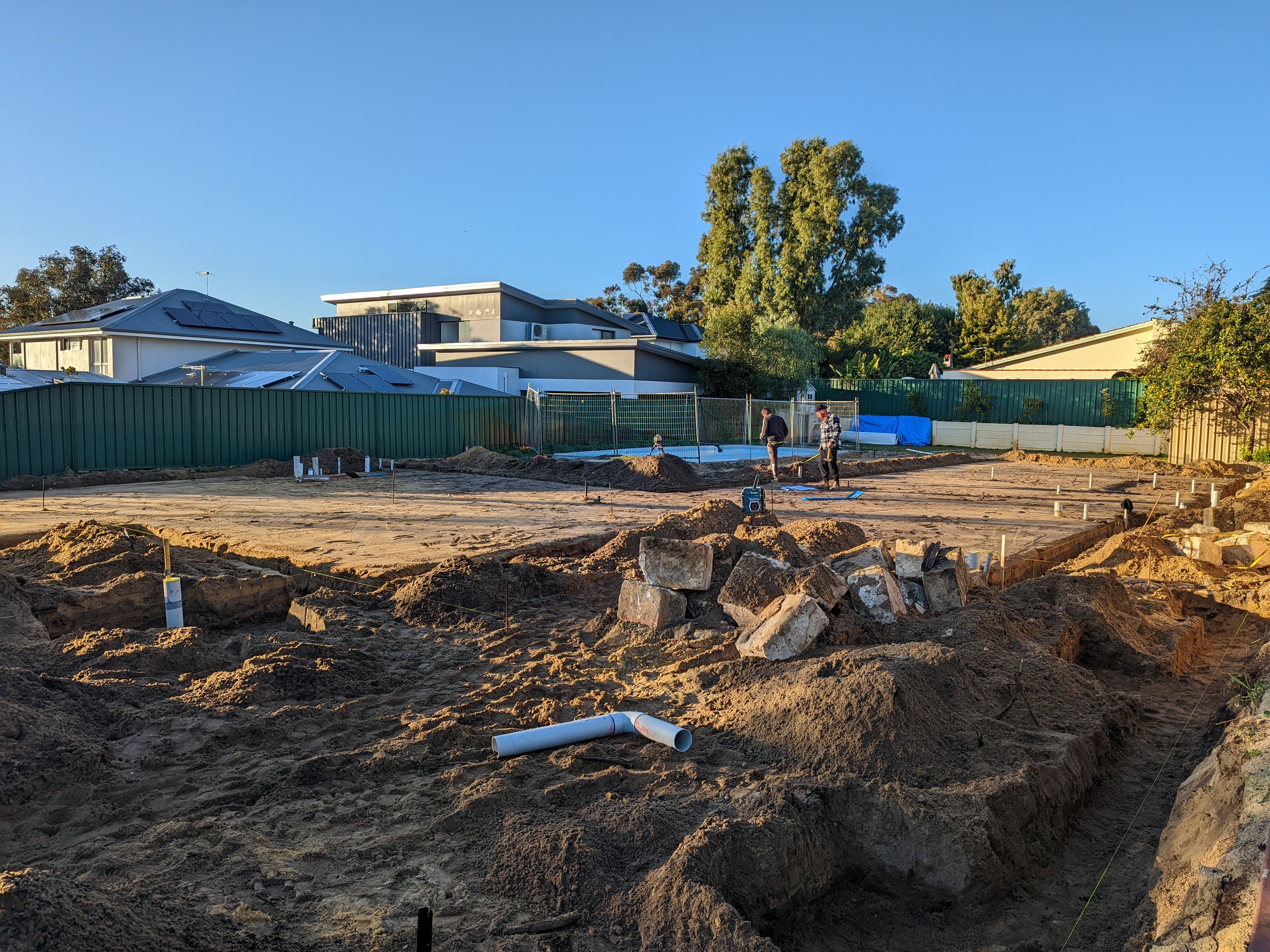 Work continued on Monday to dig footings and put in more pipes for drains, downpipes, etc. Unfortunately there was a set back with one of our retaining walls where a part of it collapsed as a result of digging near it. Fortunately no one was hurt but we now need to get an engineer in to determine a way forward.